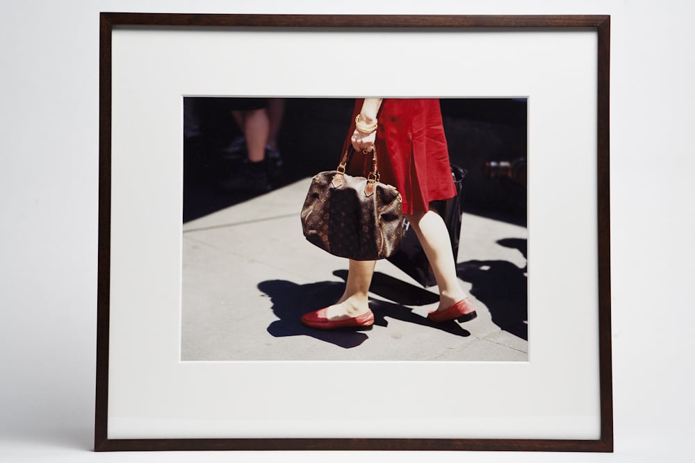 Viktoria Binschtok turns her camera lens towards our common public and commercial space. She observes quotidian, collective behavioural patterns that go unnoticed most of the time. Binschtok’s iconic work ‘-LVNY-’ (2004) is a series of 11 photographs shot on the streets of New York, capturing a small part of the hundreds of women who carry Louis Vuitton handbags. Shot in the passing, the photographs don’t concern themselves with the women’s identity. As singular photographs they would not seem to be more than coincidental snapshots, yet by producing a series of photographs, Binschtok points to the city’s accumulation of replicas of the once uniquely expensive brand Vuitton. She humorously raises questions around class, authenticity and contemporary desires by which we fetishize both the original and copy. The ubiquitous brown LV monogram print, whether featured on a genuine article or a counterfeit, transcends the different demographics, races and fashions of the people carrying them.
